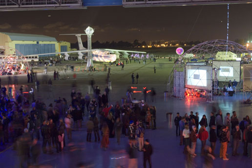 Sarah Lefton for SFGate.com wrote, “My jaw scrapes across the cement as we turn the corner into a giant airplane hangar lit up with video, lights and thousands of people with blinkies affixed to their earlobes. There are fog machines, there are twirlers, there are glowy poi being spun, we are in a Federal Government facility full of aircraft.” She continues that there is “a sizable klatch of artists who have come to show off their geeky visual and sound art in this most unlikely setting. Video artists are projecting surreal visions on the Kulper Airborne Observatory.” And people are dancing!