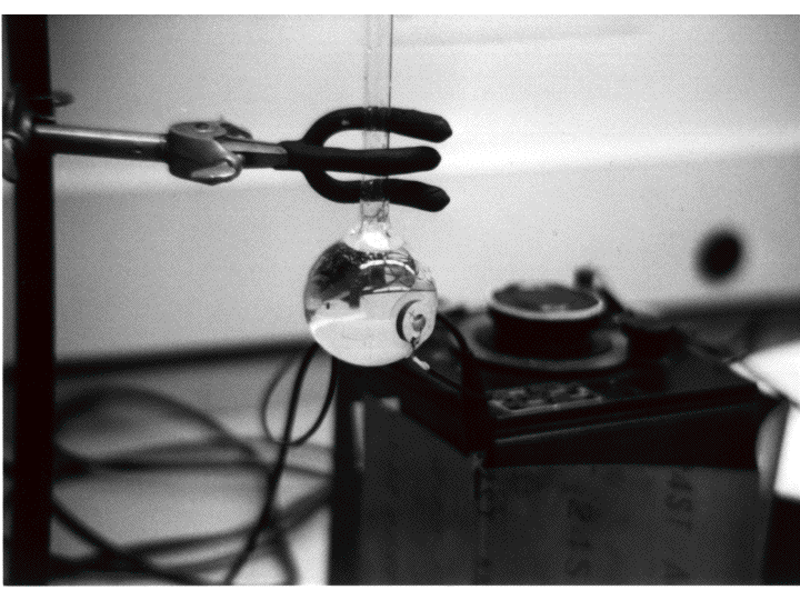 The water is poured into the flask and allowed to cool. The sound waves are adjusted to the resonant frequency of the flask, and the air is injected into the water via a syringe. If the sound waves are in precise resonance a bubble will be caught in the center.
