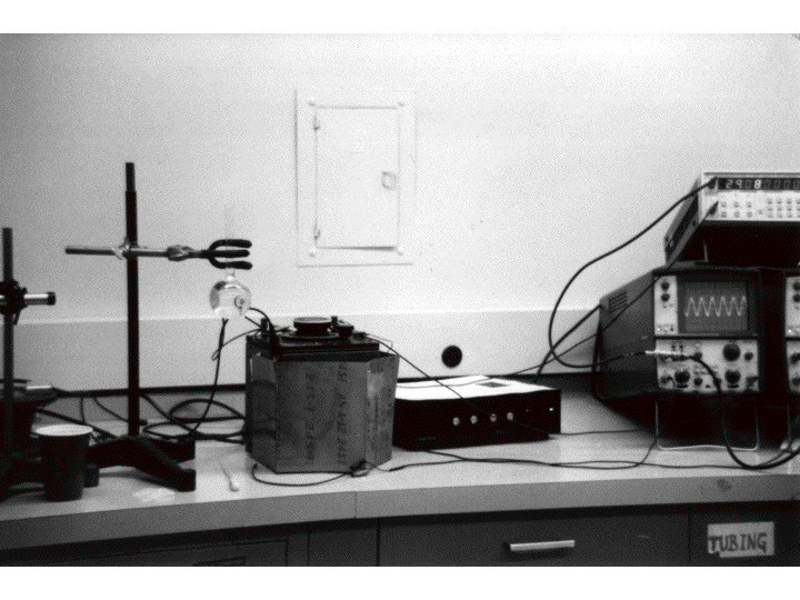 The whole setup took one semester to assemble and a second to fine-tune. The sonoluminescent light is very faint and so requires complete darkness to see. The only thing that can increase this is to bring the water closer to its anomaly point of +4° Celsius. However, at room temperature, it has the beautiful quality of appearing as faint starlight when seen.