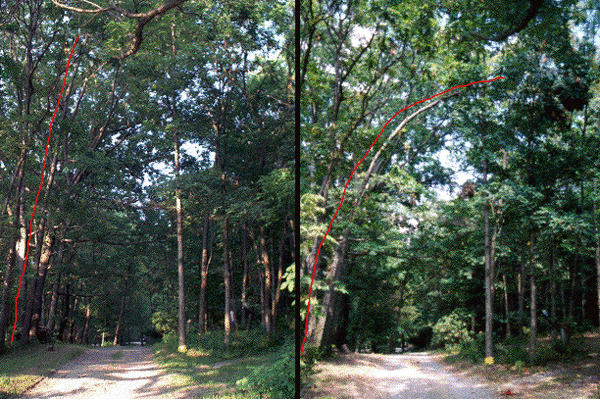 In this basic test, we see the tree in relation to a driveway over which it is being arched. The upper boughs of the tree will be brought to ground level, where they will be encouraged to produce roots before they are placed beneath the soil. The tree is ~12 inches at it's base, and the curvature seen here occurred during half of a growing season in which little extra water was supplied. This shows that sculpting is possible in a wide range of climatic conditions.